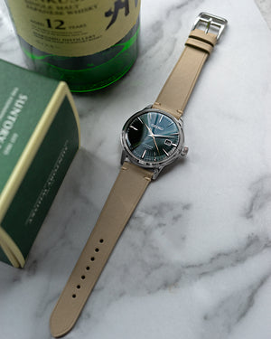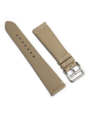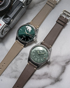 The smooth calfskin leather with its elegant natural cream like colour is sourced from Tanneries Du Puy. The strap is finished with a distinct thin heatline to give the strap a more defined shape and then double stitched with off white M30 linen thread to complete the minimalist look. There is no breaking in required on this strap, it is soft and contours the wrist well from day one.