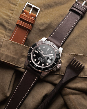 The strap is fully stitched with off white M30 linen thread then edge painted with matching colour for extra sealing and protection. There is no breaking in required on this strap, it is soft and contours the wrist well from day one.The inner lining is made from smooth Zermatt leather from Tanneries HAAS in France, the same type of lining commonly found in Hermès bags.