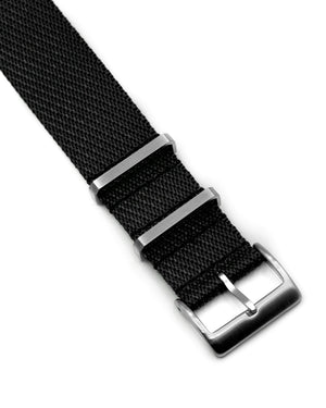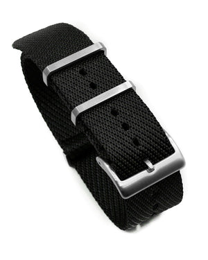 Our Nylon M II strap is back with newly improved hardware, exclusively at Monstraps. We have made adjustments to the pinhole to fit smaller size wrists and manufactured a new CNC machined angular keepers with a slimmer profile to match the high thread count twill weave fabric which comes in at only 1.2mm in thickness.