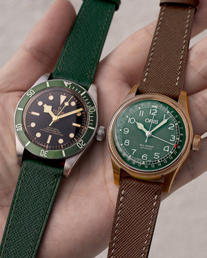 A staple of the serious watch collector. Our Saffiano goatskin leather in green is sourced from Alran S.A.S from France. The strap is fully stitched with matching linen thread then edge painted for extra sealing and protection. There is no breaking in required on this strap, it is soft and contours the wrist well from day one. Fits perfectly on your sports watches as well as your dress watches. It brings an extra dimension to your dress watch with its modern and contemporary look, you can easily transit from casual to formal outfits with our Saffiano leather strap. Saffiano leather also boasts excellent resistance to water and scratches, if taken proper care of it should last for a long time.