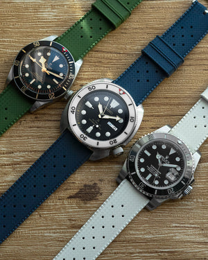 Our latest generation of tropical style strap, now molded in FKM rubber for superior durability. This is the same top grade rubber used in aerospace industry. As usual, our straps are resistant to UV rays, extreme temperatures, mechanical stresses, chemicals, and seawater. All our FKM tropic strap also comes with pre-installed quick release spring bars for easy strap change.