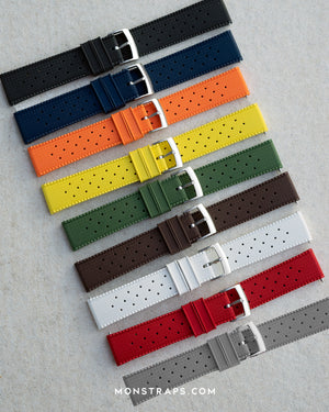 Our latest generation of tropical style strap, now molded in FKM rubber for superior durability. This is the same top grade rubber used in aerospace industry. As usual, our straps are resistant to UV rays, extreme temperatures, mechanical stresses, chemicals, and seawater. All our FKM tropical style strap also comes with pre-installed quick release spring bars for easy strap change.