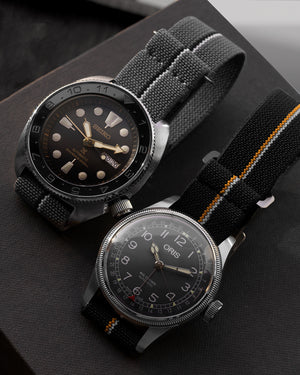 Inspired by the parachute webbing used by the French Navy “Marine Nationale” dating back to the 1950s, this elastic fabric was first used on the Tudor Submariners by the French troops during the era where watchheads were supplied without straps to the military, allowing the "Marine Nationale" to simply improvised by using their elastic parachute braid on their toolwatches.