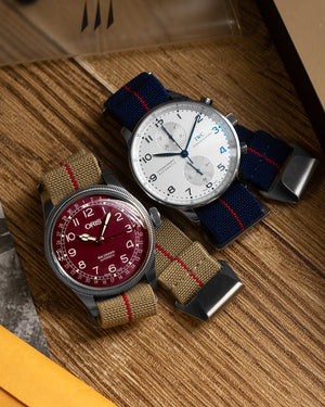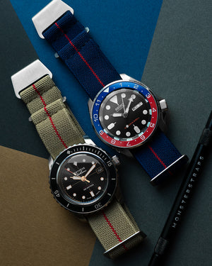 Inspired by the parachute webbing used by the French Navy “Marine Nationale” dating back to the 1950s, this elastic fabric was first used on the Tudor Submariners by the French troops during the era where watchheads were supplied without straps to the military, allowing the "Marine Nationale" to simply improvised by using their elastic parachute braid on their toolwatches.