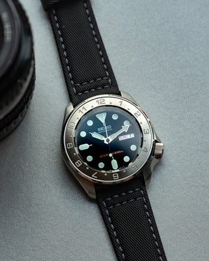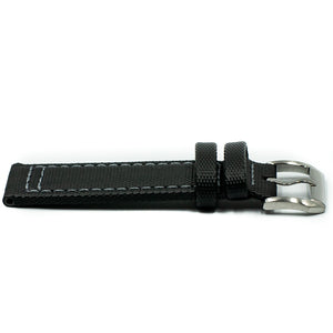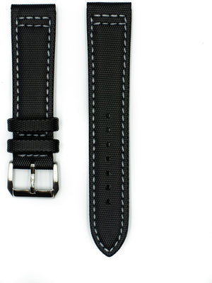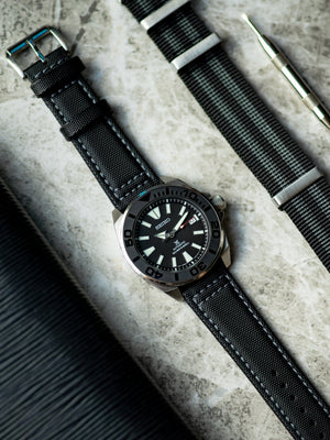Our tactical sail cloth strap is made from quick drying patterned canvas. The stitching on this particular strap is grey to match the strap color for an understated finish. Pairs exceptionally well on your pilot watch, diver and chronographs.