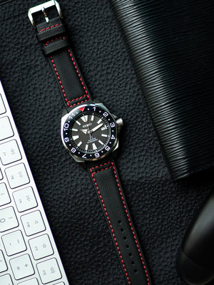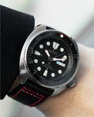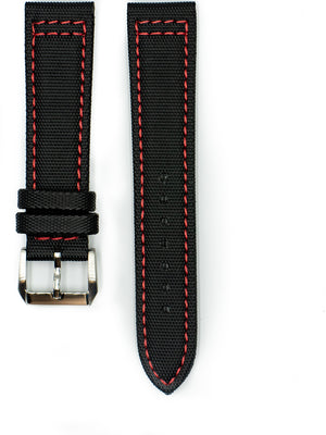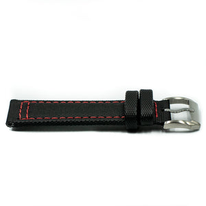 Our tactical sail cloth strap is made from quick drying patterned canvas. The stitching on this particular strap is red to match the details on your watch. Pairs exceptionally well on your pilot watch, diver and chronographs.