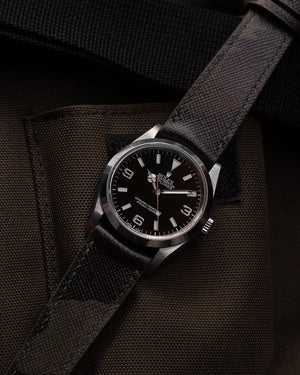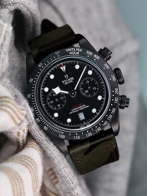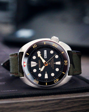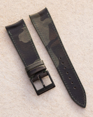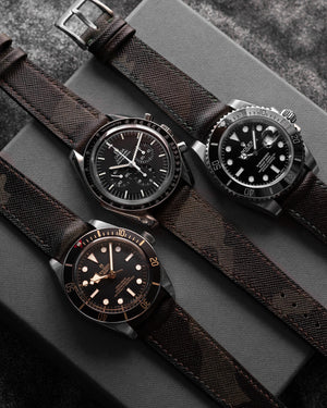 Hands down, this is one of the most versatile straps we have come across. Our Saffiano calfskin leather in exclusive dark camouflage pattern is the perfect match to your sports watch. The strap is fully stitched with matching linen thread then edge painted for extra sealing and protection. There is no breaking in required on this strap, it is soft and contours the wrist well from day one. Saffiano leather also boasts excellent resistance to water and scratches, if taken proper care of it should last for a long time.