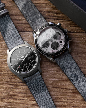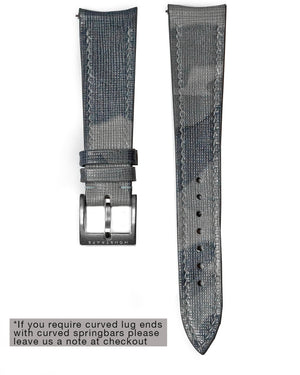 Hands down, this is one of the most versatile straps we have come across. Our Saffiano calfskin leather in exclusive arctic grey camouflage pattern is the perfect match to your sports watch. The strap is fully stitched with matching linen thread then edge painted for extra sealing and protection. There is no breaking in required on this strap, it is soft and contours the wrist well from day one. Saffiano leather also boasts excellent resistance to water and scratches, if taken proper care of it should last for a long time.