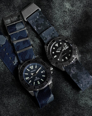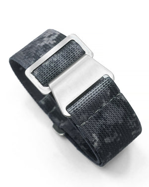 This is a limited run of our popular camo series, featuring a digitally printed fabric with a space camo pattern. Available in size 22mm and the option of Steel or PVD Coated Black hardware.