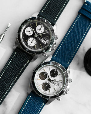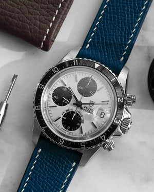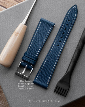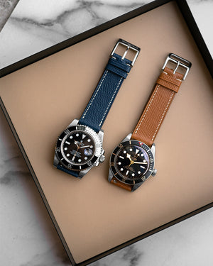 Our grained calfskin leather in the stunning Aegean Blue colour is sourced from Tanneries Du Puy. The strap is fully stitched with off white M30 linen thread then edge painted with matching colour for extra sealing and protection. There is no breaking in required on this strap, it is soft and contours the wrist well from day one. This rich Aegean Blue strap is a conversation piece on the wrist.