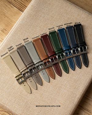 Smooth Calfskin (Tanneries Du Puy) *please note as this is a natural leather hide, each piece of strap has its unique characteristic of veining, markings or colour shade. The characteristics vary from hide to hide and but we will do our best to ensure uniformity within the same range of straps and colour*