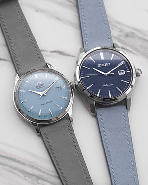 We source our soft nubuck calfskin leather from the USA and France. The hide is buffed with extra care for a consistent and supple finish. Our strap is fully box stitched with matching M30 linen thread then edge painted with matching colour for extra sealing and protection.There is no breaking in required on this strap, it is soft and contours the wrist well from day one. It is the perfect watch for Spring and Autumn weather and complements your vintage watches as well as modern dress watches. It will look at home on a vintage Seamaster, Heuer chronograph, a modern Ming watch, the Lange Sohne dress pieces and Patek Calatrava.