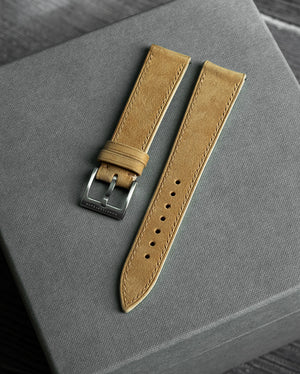 We source our soft nubuck calfskin leather in Camel from Italy. The hide is buffed with extra care for a consistent and supple finish. Our strap is fully box stitched with matching M30 linen thread then edge painted with matching colour for extra sealing and protection. There is no breaking in required on this strap, it is soft and contours the wrist well from day one. Fits perfectly on your vintage watches as well as modern dress watches. It will look at home on a Speedmaster, Heuer chronograph or any vintage dials with patina.