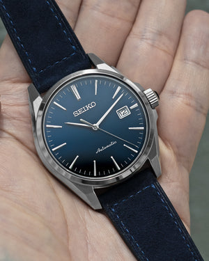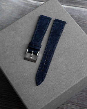 We source our soft suede goatskin leather in Dark blue from France. The hide is buffed with extra care for a consistent and supple finish. Our strap is fully box stitched with matching M30 linen thread then edge painted with matching colour for extra sealing and protection. There is no breaking in required on this strap, it is soft and contours the wrist well from day one. Fits perfectly on your vintage watches as well as modern dress watches. It looks best paired with watches with bronze or gold tones.