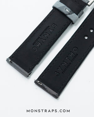 Our latest technical fabric strap is made by the skilled artisans at Synthostraps and finished with machine stitching. This new high density fabric is woven with our signature camo print and is currently available in two different colors - grey and khaki.