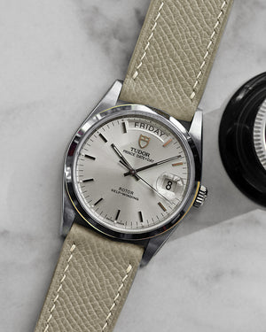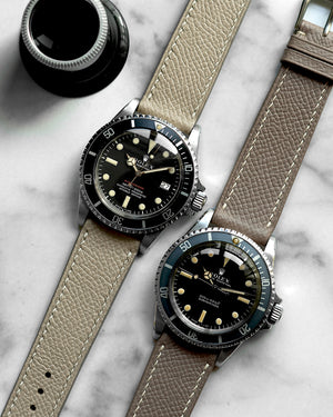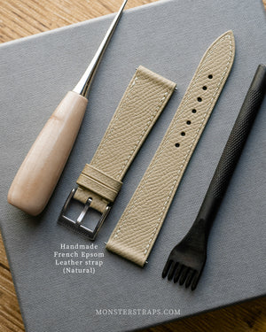 Our grained calfskin leather in the fresh Natural colour is sourced from Tanneries Du Puy. The strap is fully stitched with off white M30 linen thread then edge painted with matching colour for extra sealing and protection. There is no breaking in required on this strap, it is soft and contours the wrist well from day one. The natural Epsom strap matches well with earth tone colours and is an elegant complement to your watch for all the non-formal occasions.