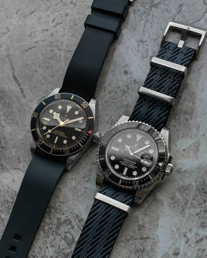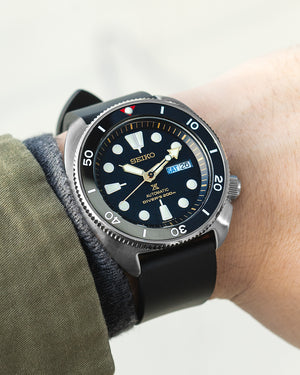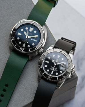 Moulded from swiss grade Fluoro-Elastomer (FKM) rubber typically used in the aerospace and aviation industry for class leading durability. Excellent resistance to UV rays, extreme temperatures, mechanical stresses, chemicals, and seawater. Strap is non-toxic, non-marking, non-allergen and does not attract dust.